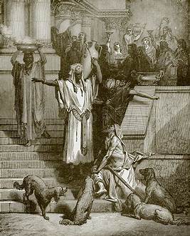 19 “There was a rich man who was dressed in purple and fine linen and lived in luxury every day. 20 At his gate was laid a beggar named Lazarus, covered with sores 21 and longing to eat what fell from the rich man’s table. Even the dogs came and licked his sores.22 “The time came when the beggar died and the angels carried him to Abraham’s side.